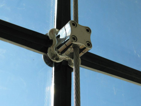 點(diǎn)支撐玻璃幕墻:整個結(jié)構(gòu)體系由張拉索/桿、不銹鋼撐桿及玻璃連接爪件等組成。幕墻整體通透感較強(qiáng),支撐體系簡潔大方,具有極強(qiáng)的裝飾功能。