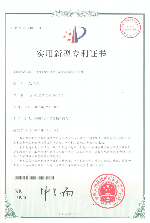 一種門(mén)窗鋁合金飾蓋的填縫專(zhuān)用膠條專(zhuān)利證書(shū)