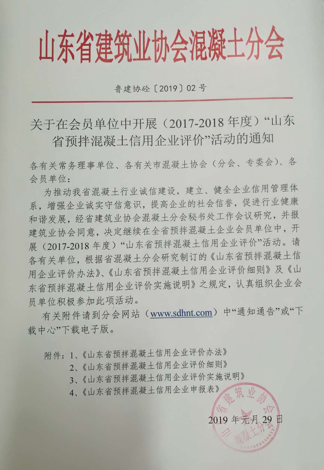關(guān)于在會(huì)員單位中開(kāi)展(2017-2018年度)“山東省預(yù)拌混凝土信用企業(yè)評(píng)價(jià)”的通知