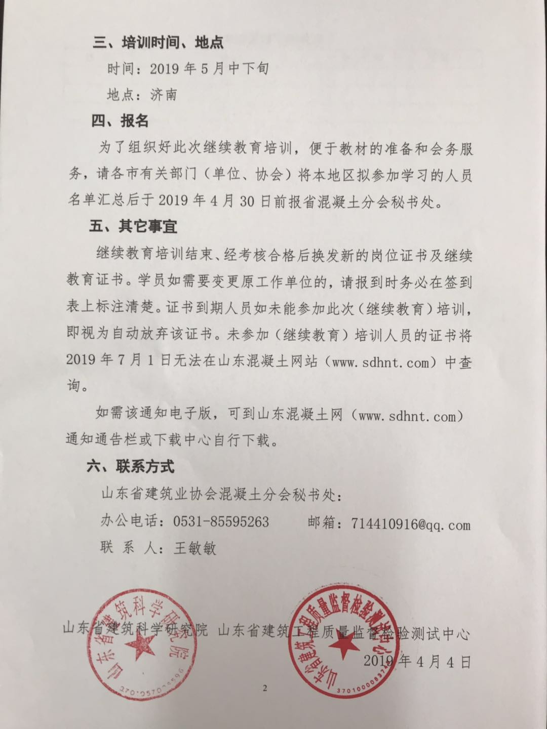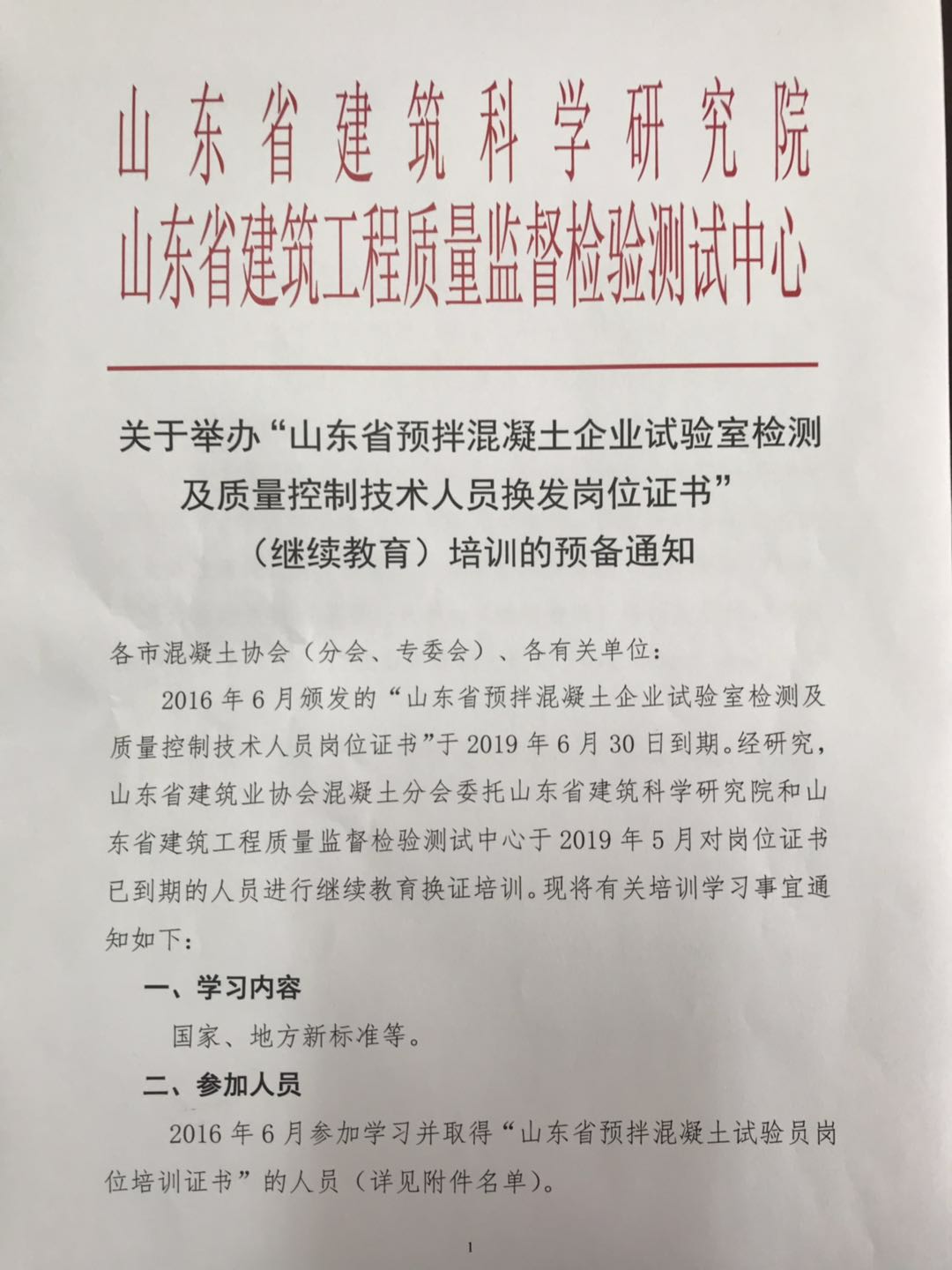 關(guān)于舉辦“山東省預(yù)拌混凝土企業(yè)試驗(yàn)室檢測(cè)及       質(zhì)量控制技術(shù)人員換發(fā)崗位證書(shū)” (繼續(xù)教育)培訓(xùn)的預(yù)備通知