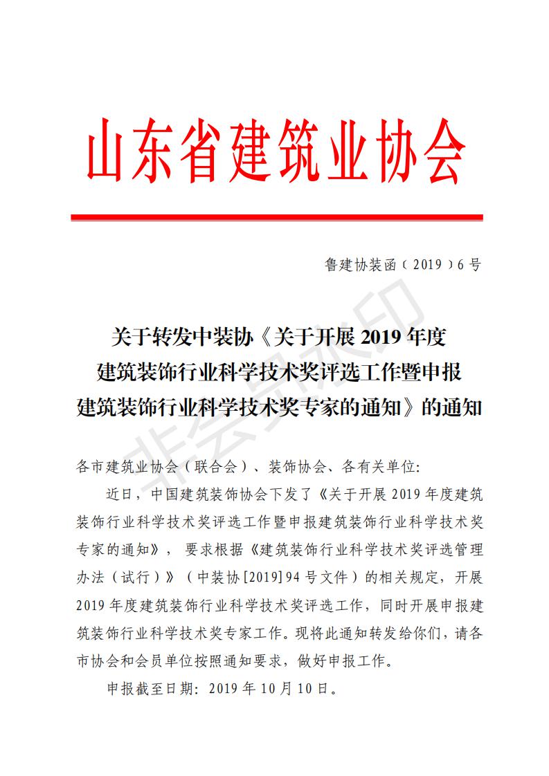 關于轉發(fā)中裝協(xié)《關于開展 2019 年度建筑裝飾行業(yè)科學技術獎評選工作暨申報