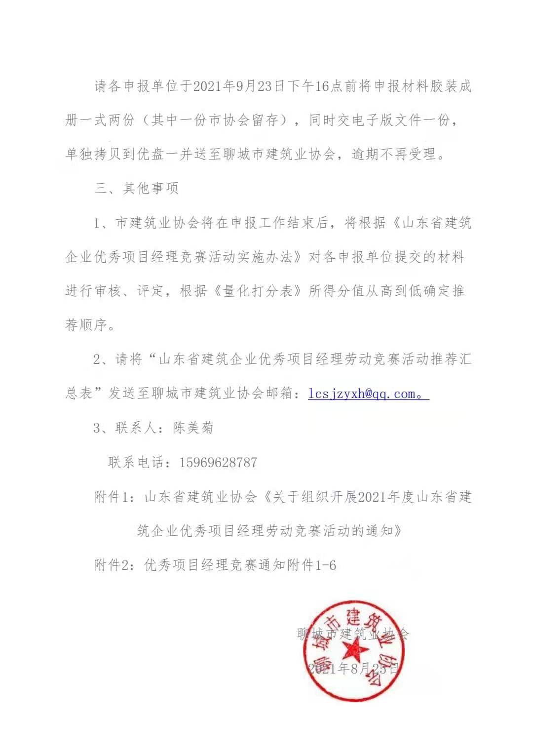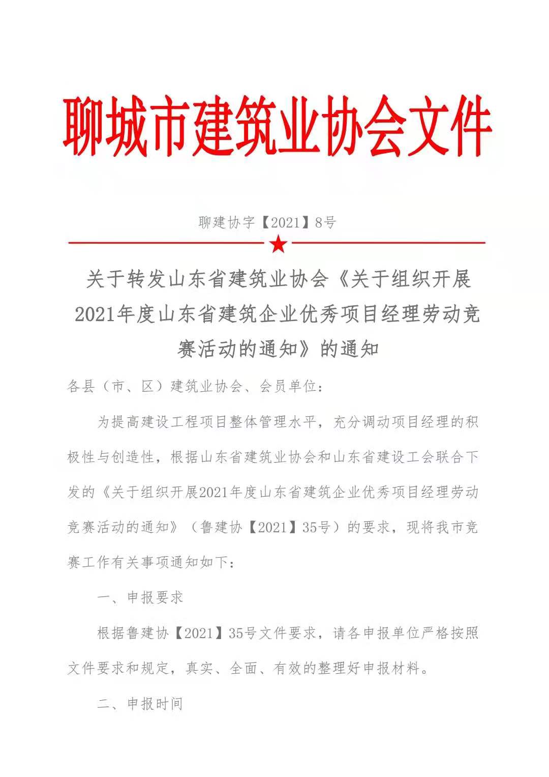 ![]() | 附件1:山東省建筑業(yè)協(xié)會(huì)《關(guān)于組織開(kāi)展2021年度山東省建筑企業(yè)優(yōu)秀項(xiàng)目經(jīng)理勞動(dòng)競(jìng)賽活動(dòng)的通知》的通知 |