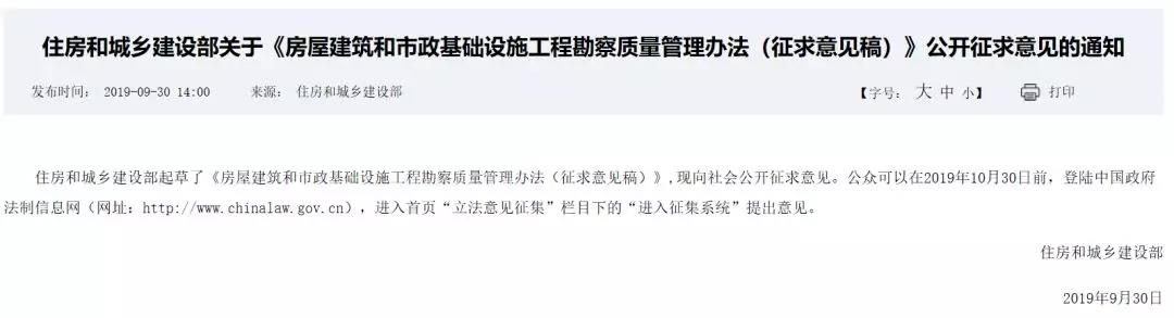 住房和城鄉(xiāng)建設部起草了《房屋建筑和市政基礎設施工程勘察質量管理辦法(征求意見稿)》,現向社會公開征求意見。公眾可以在2019年10月30日前,登陸中國政府法制信息網(網址:http://www.chinalaw.gov.cn),進入首頁“立法意見征集”欄目下的“進入征集系統(tǒng)”提出意見。住房和城鄉(xiāng)建設部2019年9月30日《房屋建筑和市政基礎設施工程勘察質量管理辦法(征求意見稿)》第一章 總則第一條 為了加強對房屋建筑和市政基礎設施工程勘察質量的管理,保證工程勘察質量,根據《中華人民共和國建筑法》《建設工程勘察設計管理條例》《建設工程質量管理條例》《建設工程安全生產管理條例》等有關法律、法規(guī),制定本辦法。第二條 在中華人民共和國境內從事房屋建筑和市政基礎設施工程(以下簡稱“工程”)勘察活動的,應遵守本辦法。本辦法所稱勘察,是指根據工程要求,查明、分析、評價建設場地的地質、環(huán)境特征和巖土工程條件,并提出合理技術建議,編制工程勘察文件的活動。本辦法所稱工程勘察文件,主要包括勘察綱要、勘察報告等文件。第三條 建設單位、勘察單位及相關人員應依法對工程勘察質量負責。第四條 國務院住房和城鄉(xiāng)建設主管部門負責全國工程勘察質量活動的監(jiān)督管理。縣級以上地方人民政府住房和城鄉(xiāng)建設主管部門對本行政區(qū)域內的工程勘察質量實施監(jiān)督管理。第五條 工程勘察行業(yè)相關社會團體應完善行業(yè)約束與懲戒機制,加強行業(yè)自律,維護公平競爭,規(guī)范勘察單位和人員依法從事工程勘察活動。第六條 鼓勵采用先進技術、工藝、設備、材料和管理方法,提高工程勘察質量水平。第二章 責任和義務第七條 建設單位應依法與勘察單位簽訂勘察合同,明確勘察任務要求、工期、費用以及各自的質量責任義務。第八條 建設單位應為勘察工作提供必要的現場工作條件。在勘察工作開展前,提供有關批準文件,勘察場地地形圖、地下管線及設施分布圖等與工程勘察有關的前期資料,并對資料的真實性、準確性、完整性負責。第九條 建設單位應加強履約管理,及時足額支付勘察費用。建設單位可委托具有勘察資質的第三方單位提供勘察質量管理服務。建設單位應按規(guī)定將工程勘察文件送施工圖審查機構審查。建設單位應組織勘察單位向設計單位、施工單位和監(jiān)理單位進行勘察技術交底。在基坑隱蔽前及時組織勘察單位、設計單位、施工單位、監(jiān)理單位等開展施工驗槽。第十條 勘察單位必須依法取得工程勘察資質證書,并在資質等級許可的范圍內承接勘察業(yè)務。勘察單位應按照有關法律法規(guī)、工程建設強制性標準、勘察合同及勘察任務要求開展勘察工作,編制工程勘察文件,并對工程勘察文件的真實性、準確性和完整性負責。工程勘察文件的編制深度應符合國家規(guī)定的要求。第十一條 勘察單位應按照有關規(guī)定,建立健全勘察質量管理制度并確保有效運行。第十二條 勘察單位有權向建設單位提出保證工程勘察質量所必需的現場工作條件、合理技術要求和合理工期。第十三條 勘察單位應在勘探作業(yè)前向作業(yè)人員進行交底。勘察單位應嚴格執(zhí)行勘察綱要和勘察操作規(guī)程,采取措施保證各類管線、設施和周邊建筑物、構筑物的安全,并做好安全記錄。第十四條 勘察單位應按照規(guī)范要求對試驗樣品的取樣、密封、送樣、保管、試驗進行管理。第十五條 勘察單位應保證工程勘察工作原始記錄的真實和準確,并應在勘察過程中及時整理、核對,嚴禁離開現場追記或者補記。項目負責人或其授權人員應及時對原始記錄進行驗收簽字。鼓勵勘察單位采用信息化手段,實時采集、記錄、存儲工程勘察數據。鼓勵勘察單位采用影像等方式對鉆探、取樣、原位測試、室內試驗等主要過程進行記錄。勘察單位在原始記錄中不得存在下列情形:(一)紙質原始記錄與電子存儲記錄不一致的;(二)試驗、測試報告與試驗、測試的過程記錄資料不符的;(三)未按規(guī)定記錄原始數據的;(四)各類記錄和報告的時間與原始記錄和報告的時間不一致的。第十六條 勘察單位應確保勘探、取樣、原位測試、室內試驗及測量等儀器和設備符合有關規(guī)定。嚴禁使用不符合規(guī)定的儀器和設備。第十七條 勘察單位依法委托具備條件的單位承擔勘探、試驗、測試工作的,勘察單位對委托的勘察工作質量負責。第十八條 勘察單位應對勘察從業(yè)人員開展職業(yè)技能培訓,提高勘察人員的技能水平和質量責任意識。司鉆員、描述員、土工試驗員等作業(yè)人員應按照有關規(guī)定接受專業(yè)培訓。第十九條 勘察單位應在勘察技術交底時向設計單位、施工單位和監(jiān)理單位說明工程勘察主要結論,解釋工程勘察文件,并提示地質條件可能引起的風險。勘察單位應參加施工驗槽,依據驗槽結果提出處理建議。勘察單位應及時解決工程設計和施工中與勘察工作有關的問題。勘察單位應按規(guī)定參加工程竣工驗收。第二十條 勘察單位應建立工程勘察檔案管理制度??辈旃ぷ魍瓿珊?,應及時將工程勘察文件和勘探、試驗、測試原始記錄及成果、質量安全管理記錄歸檔保存。保存期限應不少于工程的設計使用年限,在保存期限內不得銷毀、