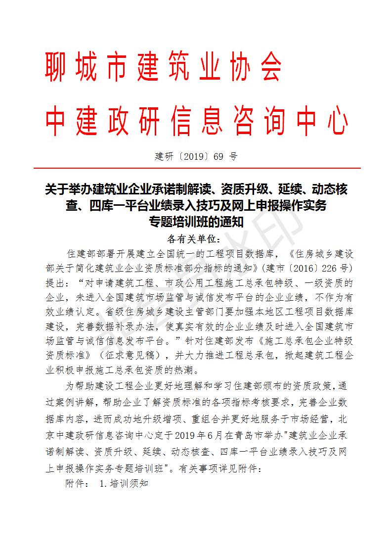 關(guān)于舉辦建筑業(yè)企業(yè)承諾制解讀、資質(zhì)升級、延續(xù)、動態(tài)核查、 四庫一平臺業(yè)績錄入技巧及網(wǎng)上申報操作實務(wù) 專題培訓班的通知