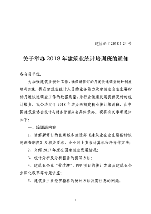 [轉發(fā)]中國建筑業(yè)協(xié)會關于舉辦2018年建筑業(yè)統(tǒng)計培訓班的通知